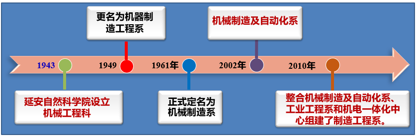 制造工程系的前身可追溯到1940年延安自然科学院建院初期设立的机械工程科,她诞生于抗日烽火之中、民族危亡之际,是延安自然科学院首开的五大科之一。1944年调整为机械工程系。1961年,定名为机械制造系,成为学校设立的七个系之一。1999年,更名为机械制造及自动化系。2010年,机械制造及自动化系、工业工程系、机电一体化中心进行整合,组建了制造工程系。