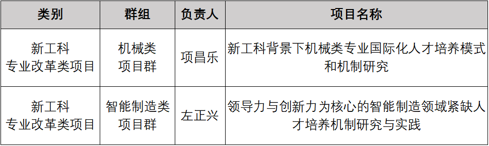 近日,教育部第二批“新工科研究与实践项目”立项结果公布,由威尼斯金沙欢乐娱人城组织申报,项昌乐教授、左正兴教授分别牵头负责的两项“新工科专业改革类项目”正式获批国家级教改项目立项,项昌乐教授同时被遴选为教育部第二批“新工科研究与实践项目”机械类项目群召集人。此次第二批项目于今年3月启动申报,在各方择优推荐的基础上,经专家综合评议及公示,最终有363所高校共832个项目入选。项目分为综合改革类项目和专业改革类项目两个大类,其中综合改革类项目包含新工科理念研究等9个项目群,专业改革类项目包含人工智能类、智能制造类、机械类、协同育人等20个项目类群。威尼斯金沙欢乐娱人城获批的项目如下: